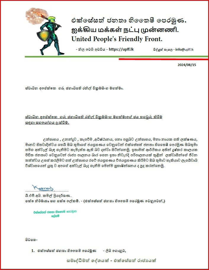 එතුමා සියළුම පක්ෂවලින් පොදුවේ රාජ්ය වැටි ඇති අවස්ථාවේ දි රජ්ය සහ රට වැසියන් වෙනුවෙන් උදව් උපකාර ඉල්ලුව ද එසේ කිරීමට ඇතැම් පක්ෂ අපේක්ෂකයන් කටයුතු නොකල බව අප දන්වන්නෙමු. ඔවුන්ගෙන් එතුමාට කිසිදු සහය දැක්වීමක් අප සියලු දෙනාට දැක ගත නොහැකි විය. ජනාධිපතිවරයෙකු නොමැතිව දින ගණනාවක් ගත වුවද ජනපතිකම බාර ගැනීමට කිසිවකු නොමැති සේයාවක් අපට දක්නට ලැබුණි. ඇතැම් අයට බහුතර සහයක්ද ලබා ගැනිමට හැකියාවටද අදක්ෂ විය. එම අවස්ථාවේ දී සියළුම පක්ෂ එකතු වී අවශ්ය වූයේ අර්බුදකාරී තත්වය සමථයකට පත් කර රට සංවර්ධනය කරලීම සහ මහජනතාව වෙනුවෙන් කටයුතු කිරීමයි. එම වගකීමෙන් පරිබාහිර ව ඇතැම් පක්ෂ දේශපාලනය තුළ දේශපාලන පමණක් ස්ථාන ගත වන බවට දක්නට ලැබුණි. එම නිසා අප සියළුම දෙනාට යුතුකම හා වගකීම ඉටු කළ යුතු කාලය එළඹ ඇත. මෙවර ජනාධිපතිවරණයෙන් ම උසස් ජයක් ලැබේවායි අප දේශපාලන පක්ෂයක් වශයෙන් ඒතුමාට ප්රාණාමය පුද කරන්නෙමු. එතුමාගේ ජයග්රහණය, එතුමාගේ ජයග්රහණයක් නොව රටේ ජයග්රහණයක් වන බව දන්වන්නට කැමැත්තෙමු.