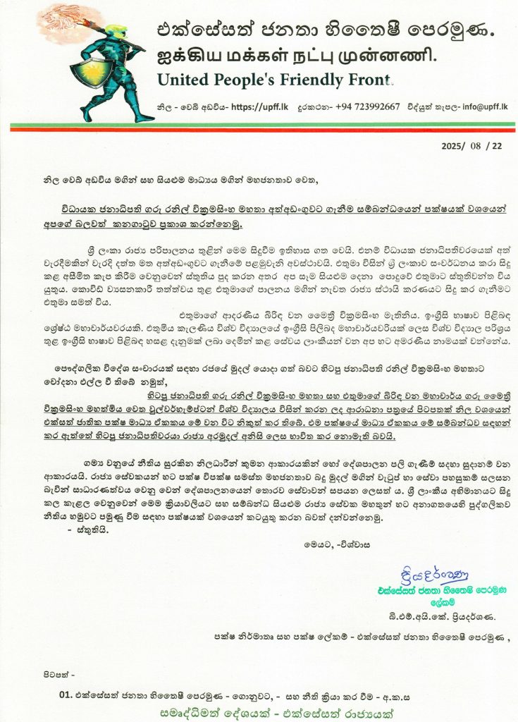 විධායක ජනාධිපති ගරු රනිල් වික්රමසිංහ මහතා අත්අඩංගුවට ගැනීම සම්බන්ධයෙන් පක්ෂයක් වශයෙන් අපගේ බලවත් කනගාටුව ප්රකාශ කරන්නෙමු